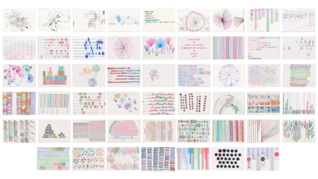 A fine novembre il Museum of Modern Art (MoMA) di New York ha acquisito nella sua collezione permanente 104 cartoline che le designer Giorgia Lupi e Stefanie Posavec si sono spedite da un lato all’altro dell’oceano Atlantico, tra settembre 2014 e settembre 2015. Le cartoline fanno parte di un progetto artistico che si chiama Dear Data, cioè “Cari Dati”: Lupi e Posavec se le sono scambiate per raccontare la propria vita l’una all’altra, raccogliendo dati come si fa per calcolare le statistiche e ricavandone poi i relativi grafici. È una una sorta di racconto autobiografico che si serve di numeri e illustrazioni al posto delle parole e ha permesso a Lupi e Possavec, che all’inizio si conoscevano poco, di scoprire molte cose l’una sull’altra e diventare amiche.